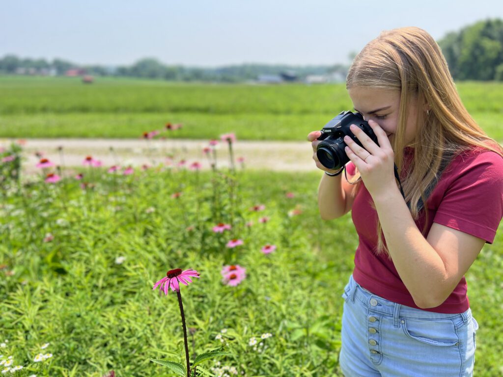 I know that students can’t sit all day – I can’t either. We learn in small blocks of time always switching between indoor and outdoor settings. One of the highlights of our teen photography camp is the setting itself. We make great use of our 1500 square foot studio space for some non-distracted teaching time, but we are outside as much as possible. Our 70-acre farm offers endless opportunities for capturing stunning images. From golden hour lighting over rolling fields to macro shots of flowers, insects, and textures, students will learn to adapt to different lighting conditions and subjects in real-time.